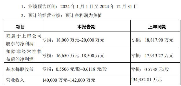 中国经济网北京1月20日讯中欣氟材(002915)(002915.SZ)17日晚表现2024年年度事迹预报,2024年,公司包摄于上市公司股东的净利润预测亏本18,000万元至20,000万元,上年同时亏本18,817.90万元;扣除非平淡性损益后的净利润预测亏本16,650万元至18,500万元,上年同时亏本17,913.27万元;基本每股收益预测亏本0.5506元/股至0.6118元/股,上年同时亏本0.5738元/股;买卖收入预测140,000万元至142,000万元,上年同时134,352.81万元。